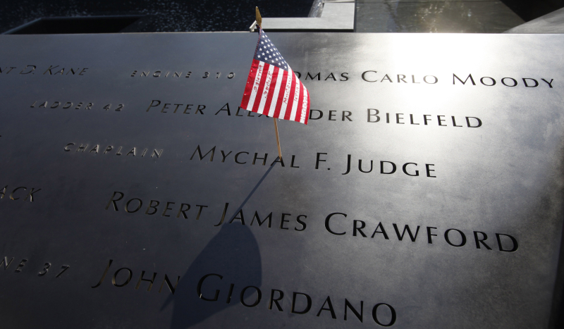 An American flags sits in the name Mychal F. Judge, a chaplain for the New York Fire Department who was the first certified casualty during the terrorist attacks on September 11, 2011 on the World Trade Center towers (Photo by Mike Segar-Pool/Getty Images)